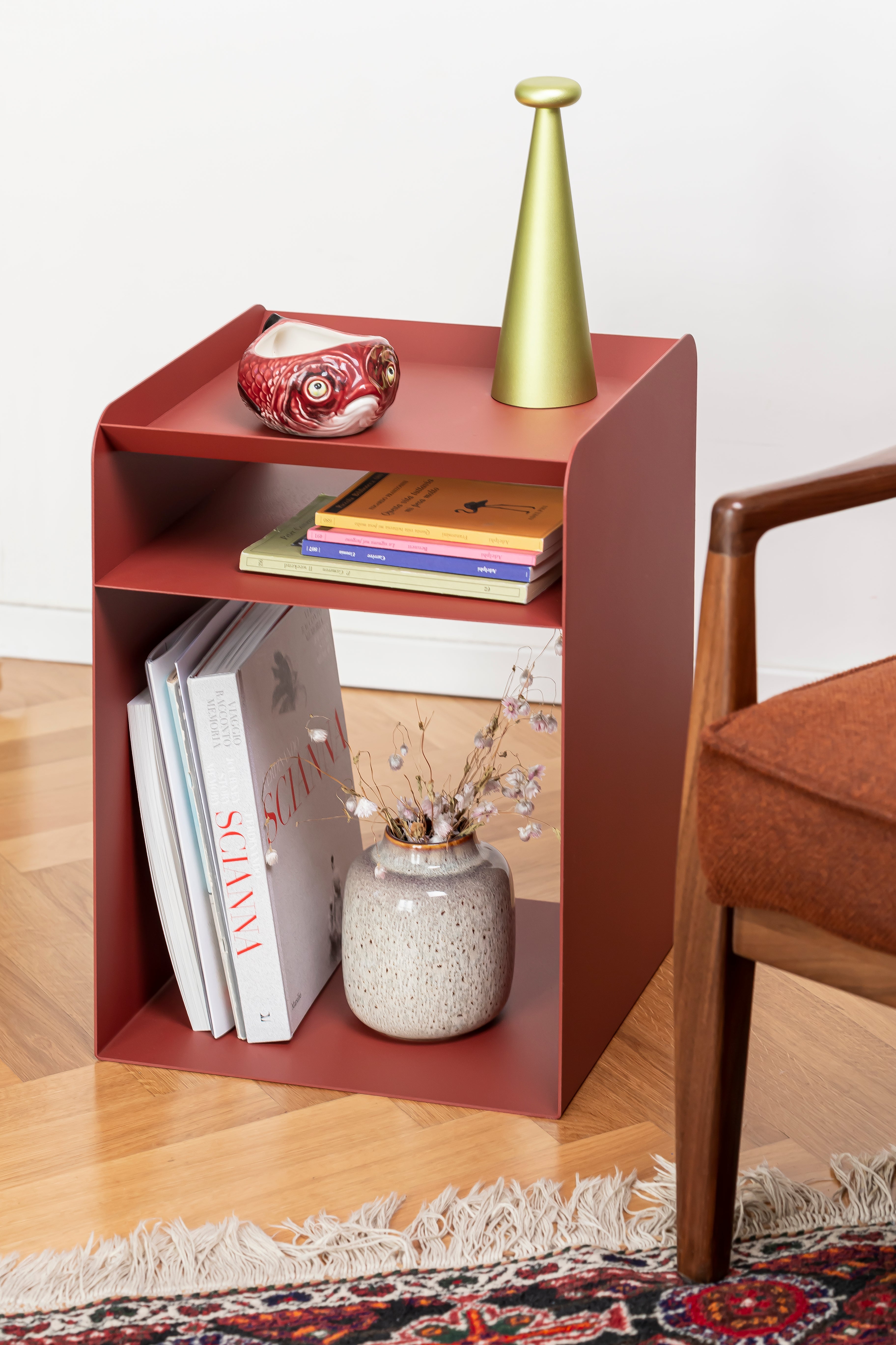 Slope è un elegante sidetable in metallo dal design minimal e moderno. Perfetto come tavolino di servizio accanto al divano o come comodino minimalista, offre una doppia superficie d'appoggio versatile. La sua forma ad angolo non solo aggiunge un tocco di dinamismo all'ambiente, ma può trasformarsi in una pratica soluzione per ottimizzare gli spazi.