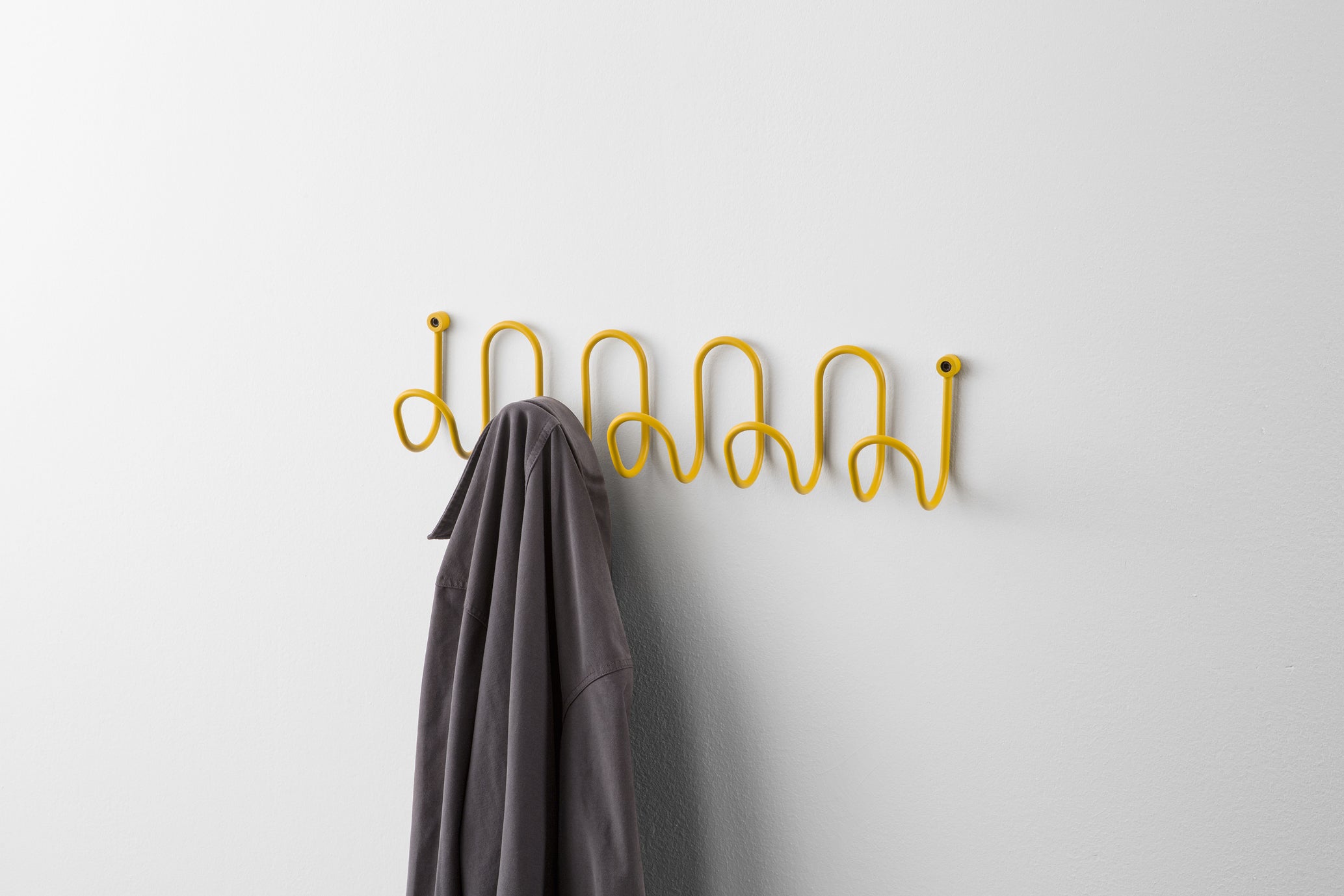 Cocò is a simple and colorful young wall coat hanger. It is made up of a single C-shaped metal element and can also be rotated and fixed at the customer's discretion. The fixing plug is included in the package.